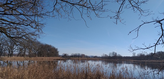Viel Muße-Potenzial: der See in der Mitte, 300 Jahre alte Eichen links und ganz in der Ferne der nochmal schneebedeckte Mt. Everest of Bayerwald