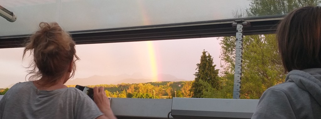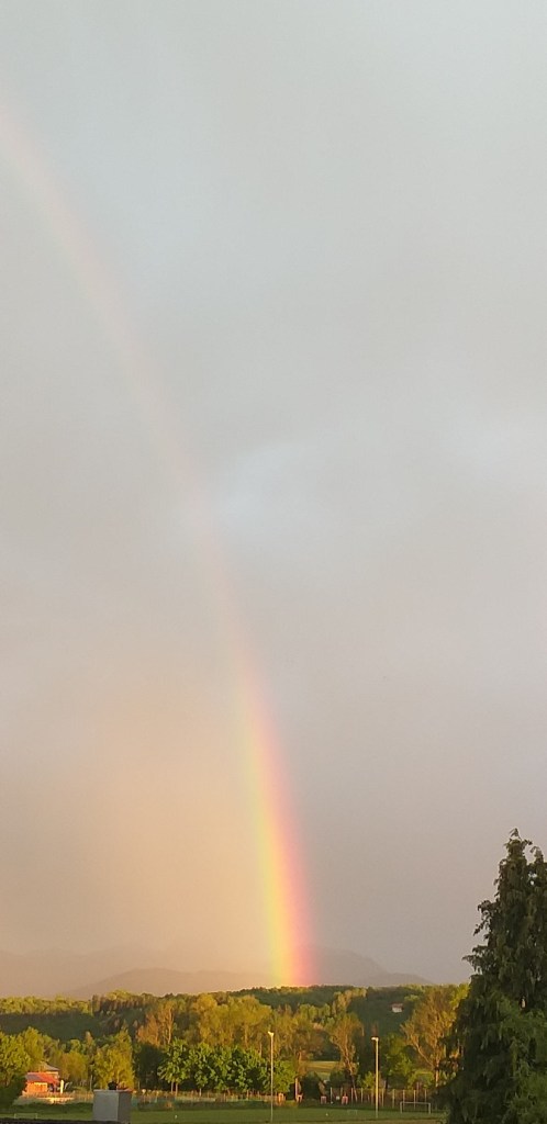 „communify“ fällt mir wieder ein, eine Wortschöpfung, die aus einem Verhörer entstanden ist. Dieses Verb gibt es nicht wirklich im Englischen. Es ist eine Zusammensetzung von community ‚Gemeinschaft‘ und unify ‚vereinen‘ bzw. ‚sich vereinigen‘. Menschen kommen zusammen. Und vereinigen sich. Zu einer gemeinsamen Idee oder Vision hin. So wie draußen der Regenbogen wie eine (dreifache) Flamme in der Landschaft stand, so standen uns die Flammen auf der Stirn bzw. über den Köpfen. Das ist Pfingsten. Auch 2021. Sich sammeln und das Leben weiterentwickeln. Evolution.