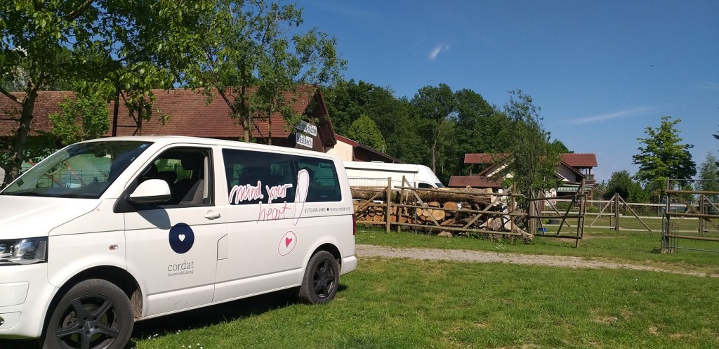 Den kleinen Gasgrill auspacken, Abendessen kochen. Dann taucht „Erika“ auf. Die Mutter von Eva. Zuerst begrüßt sie die Stute, winkt und grüßt auch uns schon von weitem. Und kommt dann auf einen Ratsch zu uns. „Herzensbildung“ machen wir, steht auf unserem Auto. Das interessiert sie. Und erzählt selbst von ihren Engelseminaren, von ihrem Massageangebot und ihrer Auraarbeit. Dem kleinen Café in der Orangerie. Und dem Leben hier mit den Tieren. Da leben wieder mal welche ein Herzensprojekt. Und ein Eingebundensein als Großfamilie aus vier Generationen in das große Ganze und in der Natur – vom Wald über die Herzfrucht Erdbeere und die Bienen bis zum Dammwild, der Katze, dem Hund, Pferd und Esel. Auch wir träumen von einem Hof mit weitläufigem Gelände, gemeinschaftlichem Leben und Arbeiten und wollen diese Vision jetzt ins Leben bringen. Aus solchen konkreten Beispielen wie hier kann man viel lernen.