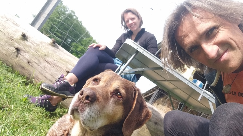 Gäuboden, wie man sich ihn vorstellt. Felder über Felder. Brettleben. Im frühsommerlichen Dunst etwas verborgen, doch gar nicht so weit entfernt: die sanften Hügel und Berge des oberen und unteren Bayerischen Waldes. Wir fahren in den Hof hinein. Eva, die junge Chefin hier, winkt uns schon herein und mit ihr ist der Hofhund. Schwanzwedelnd ohne irgendein Bellen begleitet er unser Hereinfahren und genießt unsere Aufmerksamkeit so wie wir die Seine. Währenddessen meint Eva, wir sollen hinter ihr herfahren – sie würde den Esel umquartieren, das heißt: Wir dürfen mit unserem VW-Bus den bisherigen Platz des Esels übernehmen.