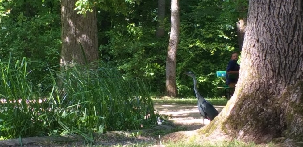 Aufgewachsen in der Nähe eines kleinen Naturschutzgebietes ist mir der Anblick eines Graureihers wie der des ihm verwandten Silberreihers durchaus vertraut. So nah und quasi mitten in der Stadt habe ich allerdings noch keinen Reiher gesehen oder gar so in Aktion erlebt. Nachdem er sich ordentlich umgeschaut hat, wird unser Reiher nämlich zielstrebig. Er platziert sich an einer Stelle und fixiert, was er aus der Speisekarte gewählt hat: seine Beute. Völlig gerade hat er sich aufgerichtet. Wie ein Kran fährt er Stück für Stück seinen Hals samt Schnabel nach vorne. Und weiß genau, wann es soweit ist: Fokussiert und genau um den richtigen Moment wissend packt er schließlich zu und verspeist einen Frosch. Und während ich gedanklich bzw. im Herzen hin und her wandere zwischen „Bravo, so unaufgeregt effizient geht Beutefang“ und „der arme Frosch“, sieht sich unser Reiher glatt noch einmal auf der Speisekarte um: Man kann ja mal schauen, was unter „Dessert“ zur Auswahl steht.