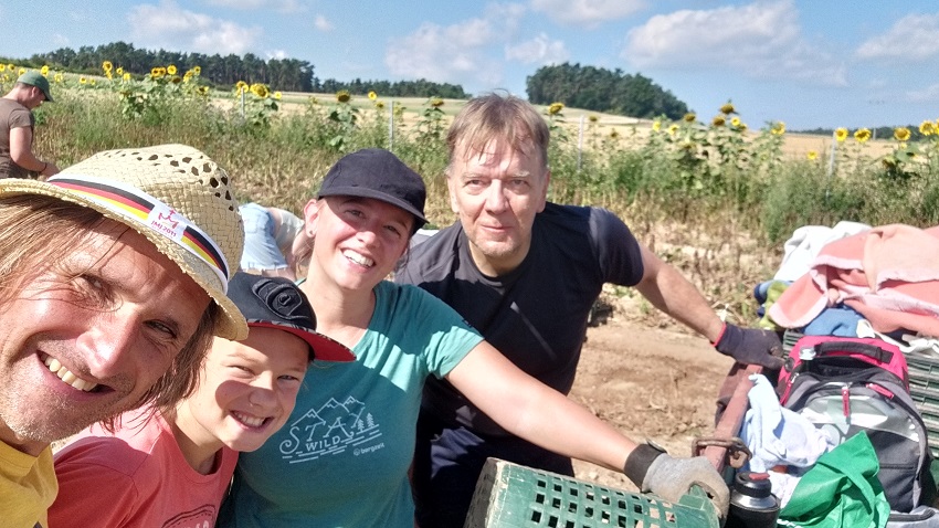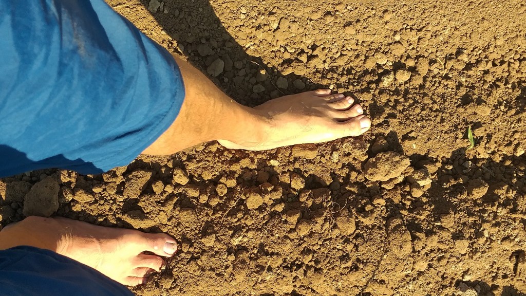 Wir sind noch ganz neu in der Solawi. Bei einem solchen Ernteeinsatz lernt man Mitbauern und Mitbäuerinnen kennen. Und auch die Gemüsebauern und Betreiber*in der Solawi, Michl und Sophie, mal von der professionellen Seite – beziehungsweise: in ihrem Element. Auf ihrem Acker. Mit ihrem Wissen, mit ihrer Erfahrung. Das letzte Mal war ich bei einer Kartoffelernte vor über 40 Jahren. Als Kind auf dem Feld meiner Tante. Das war im Gäuboden. Mit Vollernter schon. Die aufgebrochene Erde zu riechen, ist ein De-ja-vù. Eine wahre Er-inner-ung. Ich finde es wunderbar, das hier und heute wieder zu erleben. Ich empfinde Erdung. Ich ziehe meine Schuhe aus: Ist das nicht „heiliger Boden“ hier? Haut an Haut mit „Mutter Erde“, die diese wunderbaren Feldfrüchte wachsen lässt.