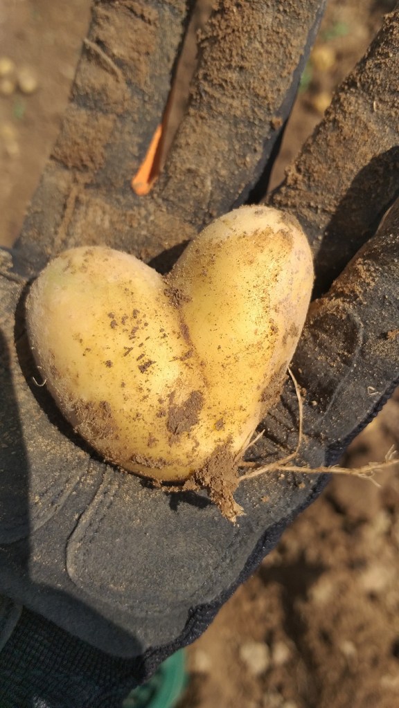 Immer wieder tauchen Kartoffel wie Phantasiewesen aus der Erde auf. Und es sind so viele herzförmige dabei. Im Handel bekommt man die Einheitsform. Kartoffel in der Norm. Wer das hier sieht, merkt erst, was da an Vielfalt nicht nur der Sorten sondern auch der Formen verloren gegangen ist. Die Herzkartoffeln bzw. Kartoffelherzen sind wie ein Spiegel dieser Szenerie: Hier haben Menschen ihr Herzensprojekt umgesetzt: Auf eigenem Land in einem Projekt solidarischer Landwirtschaft Gemüse anbauen und mit anderen zusammen direkt vermarkten. Und diese Berührung im Herzen ergreift auch die Mitbauern. Und selbst die Erde bringt bei soviel Herz Kartoffel in Herzform hervor. Das ist Herzensbildung in Form von Landwirtschaft.