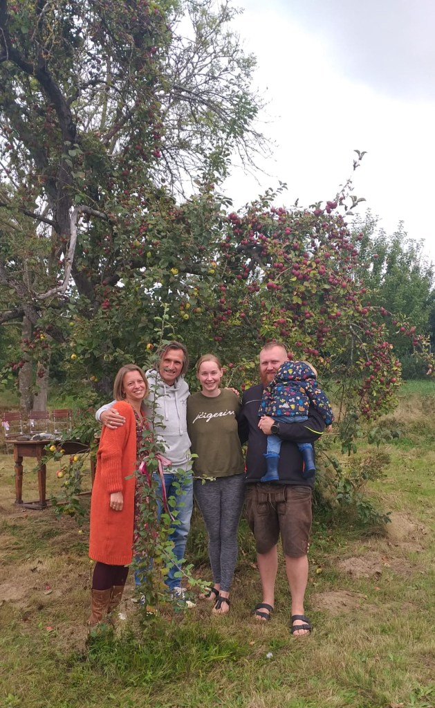 Nicki und ich mit Theresa, Jens und Erik (von links) vor dem großen Apfelbaum – und hinter dem jungen Ableger mit Schleife.