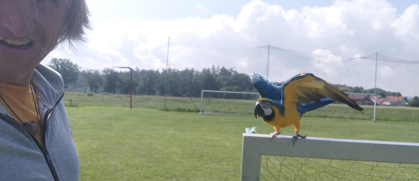 Doch ich werde schnell eines anderen belehrt: Kaum stehen die Tore, fliegt mich der Papagei von hinten an – offenbar mit der Absicht, auf mir zu landen. Ich bin darauf nun überhaupt nicht vorbereitet, erschrecke, was wiederum den Vogel irritiert. Der nimmt schließlich auf dem Tor neben mir Platz. Ich schau ihn an und er mich. Mir gefällt der Kerl. Ich zieh das Handy raus – und schon sitzt er mir auf der Schulter. Cool… Wann sitzt einem schon mal ein Papagei auf der Schulter? Und was möchte er mir sagen?