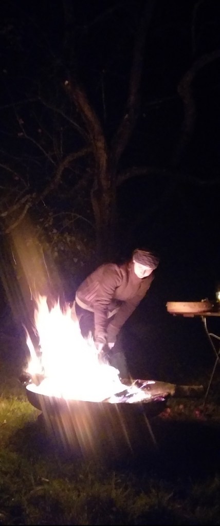 Er geht voraus. Nimmt den Schleichweg, wo wir uns zwischen den Nebengebäuden und der Schlosskapelle hindurchdrücken den kleinen Hang hinauf. Nach wenigen Schritten finde ich mich unter dem Apfelbaum wieder, wo Nicki und ich noch vor wenigen Wochen geheiratet haben. Sommer war da noch. Und helllichter Tag. In der großen Schale brennt ein Feuer. Theresa empfängt mich und erläutert mir nochmal, was sie vorhat.