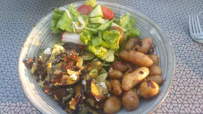 Als ich zurückkomme und Nicki die Köstlichkeiten sieht, richten wir spontan ein Lagerfeuermenü an. Wir kochen die winzigen Kartöffelchen und packen sie mit dem Zucchini und dem Fenchel auf die Schale, die direkt über dem Feuer steht. Wir machen uns den Salat dazu und es entsteht ein zauberhaftes Abendessen.