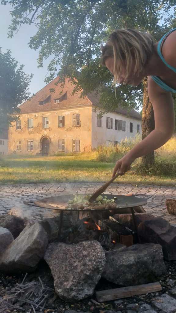 Ja, so geht es uns selbst in den vergangenen Monaten immer wieder: Dass wir uns hier im Apfelgarten zwischen der Yurte und dem Schloss vorkommen wie Adam und Eva im Paradies. Das Kochen und Zusammensitzen am Lagerfeuer tut ein Übriges. Es bestärkt das Gefühl, dass das hier das Wesentliche ist. Die Essenz unseres Lebens: Tagsüber im Seminarraum einen Workshop, ein Training oder Coaching zu geben; damit wahrhaftige Lebens-Mittel zu kaufen; sie am Lagerfeuer als Mahlzeit anzurichten; sich zur Nacht hin in die Yurte zu legen, um zu schlafen; und schließlich am nächsten Morgen dem Leben zu danken für einen neuen Tag.