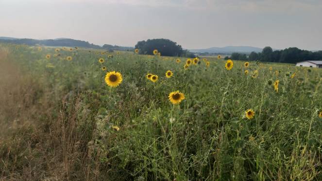 Per Rad mach ich mich auf den Weg zur Klostermühle. Um dort unseren Anteil an Gemüse und Salat aus dem solidarischen Landwirtschaftsprojekt (Solawi) der Lebensgärten Bayerwald e.V. abzuholen. Es ist hochsommerlich heiß, aber auf dem Rad kühlt der Fahrtwind. Ich fahre über die kleinen Straßen und Feldwege über die sanften Hügel. Schaue auf das reife Getreide, komme an Sonnenblumen vorbei, an Höfen und durch kleine Dörfer.