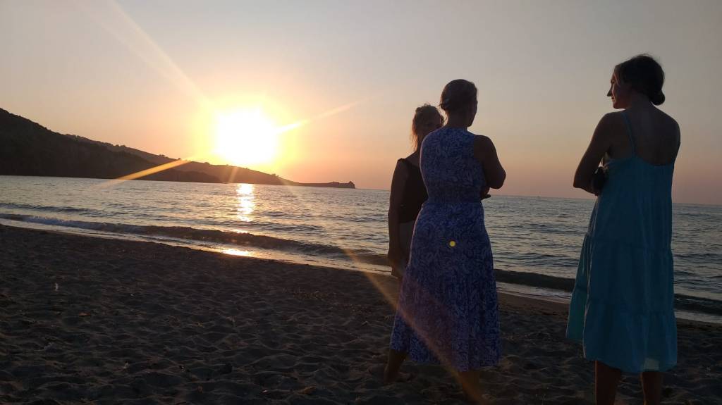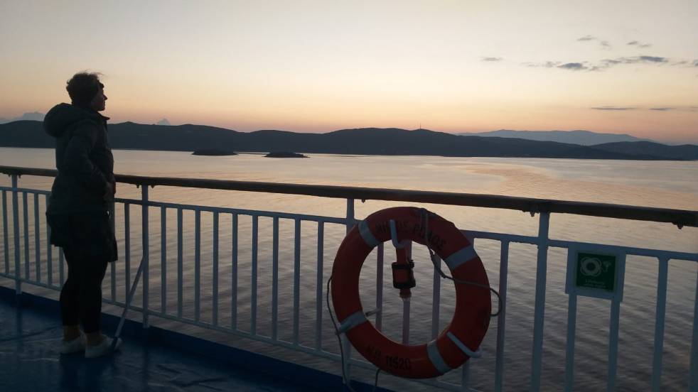 Von weitem taucht im Morgenlicht irgendwann die Insel Lesvos auf, Schritt für Schritt kommen wir näher; wir sehen die Küste auftauchen, das Hafengelände, den Hafen. Und irgendwie fühle ich mich ein ganz kleines Bisschen wie Charles Darwin, Christopher Columbus oder mein zeitgenössischer Lieblingsabenteurer Erling Kagge. Wir haben die Nacht irgendwo zwischen den Sitzen auf dem blanken Boden und ohne Decke (wir sind nur mit Handgepäck am Weg) zugebracht und viel Schlaf war nicht dabei. Aber wir sind gespannt und neugierig, was uns auf der Insel erwartet. Wir fühlen uns erfrischt von der Luft auf dem Außendeck des Schiffs; von der internationalen Atmosphäre der Menschen, der Sprachen; und vom Anblick der Insel und nach einer Taxifahrt auch vom (uns vom letzten Jahr vertrauten) wunderschönen „Milelia Inselgarten“*, von all den Bildern, die unsere Augen und von den Erinnerungen, die unser Herz erreichen.