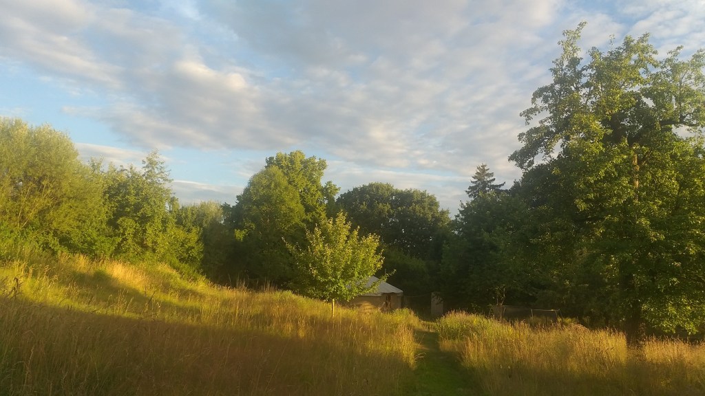Ganz hinten im Eck des weitläufigen Grundstücks steht sie. Die Yurte fungiert wie ein Stopsel, hat jemand gesagt, der sich mit dem Energiefluss hier auf dem Gelände befasst hat. Von der tausendjährigen Eiche über das tausendjährige Schloss bis zur Yurte gibt es energetisch eine Linie. Die Yurte hilft, dass die Energie nicht abfließt. Tatsächlich spürt, wer aufmerksam die Yurte betritt, darin förmlich gesammelte Energie. Wie eine Badewanne, wie ein Behälter.