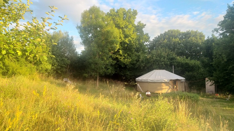 Ganz hinten im Eck des weitläufigen Grundstücks steht sie. Die Yurte fungiert wie ein Stopsel, hat jemand gesagt, der sich mit dem Energiefluss hier auf dem Gelände befasst hat. Von der tausendjährigen Eiche über das tausendjährige Schloss bis zur Yurte gibt es energetisch eine Linie. Die Yurte hilft, dass die Energie nicht abfließt. Tatsächlich spürt, wer aufmerksam die Yurte betritt, darin förmlich gesammelte Energie. Wie eine Badewanne, wie ein Behälter.