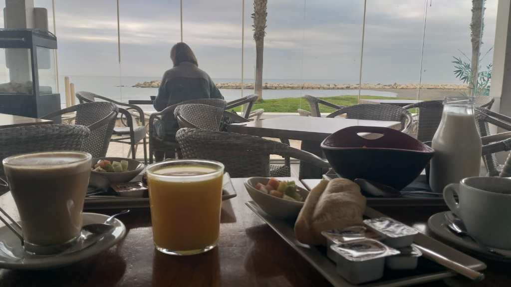 Am nächsten Tag präsentiert sich das so greifbar nahe Meer direkt vor unserem Fenster in der Sonne; es zeigt sich, dass direkt im Hotel Kaffee geröstet wird und hier unzählige Kaffeespezialitäten angeboten werden: Was ein für Spanien unerwartetes Geschenk für Kaffee-Liebhaber, wie wir es sind! Und dann begrüßt uns das „La Chancla“ mit einem geheimnisvollen Spruch auf dem Zuckertütchen, das auf der Kaffeetasse liegt: