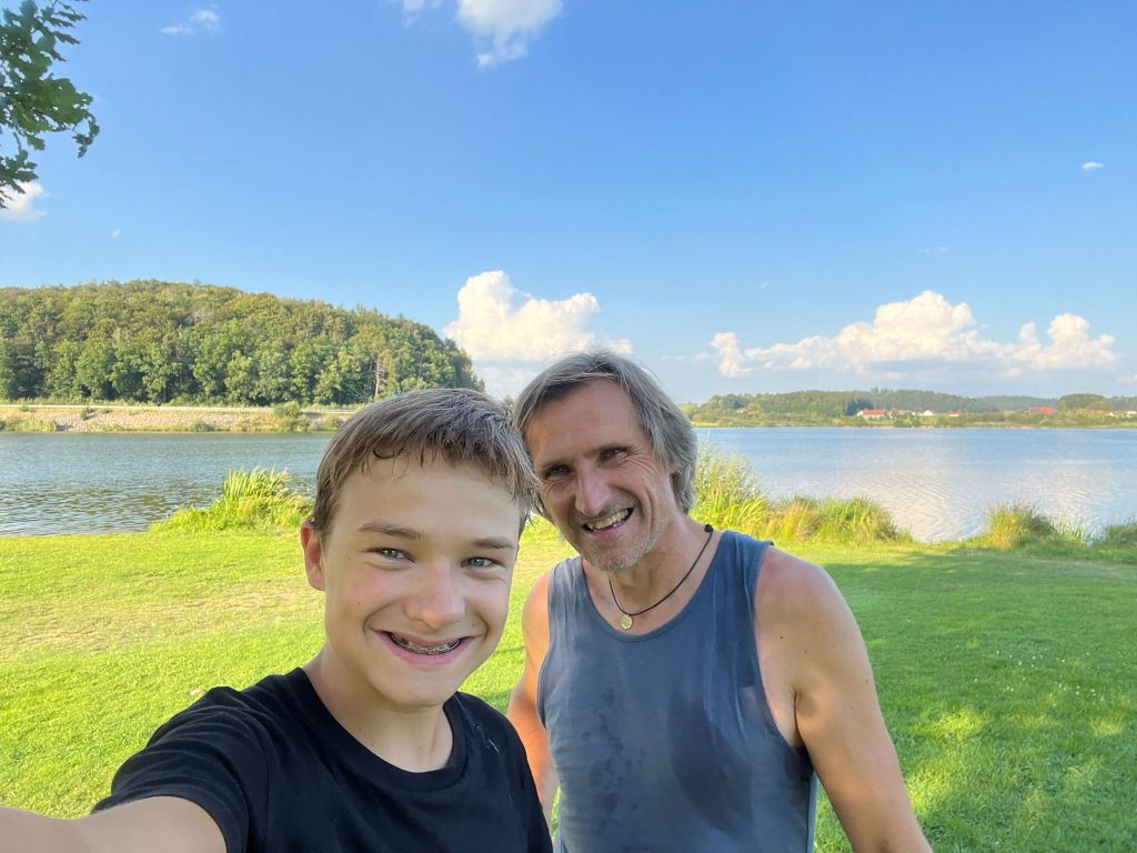 Gerade noch rechtzeitig – eigentlich sei um halb vier hier schon Schluss, aber sie sei bis 17 Uhr da heute – erreichen wir per Zug und weiter zu Fuß das Rathaus und, vorbei am leibhaftigen Toni Lauerer, das Büro der Dame und schließlich den Mann an der Stadtkasse. Mit der Urkunde der Berechtigung kann unser Abenteuer endlich losgehen. Und nach einer Stunde Fußmarsch bei über 30 Grad Hitze liegt der See vor uns, der erst vor wenigen Jahren durch das Aufstauen des Chamb entstanden ist. Das Freizeitufer ist sehr einladend sowohl zum Zelten wie auch zum Baden. Wir freuen uns, die 20 EUR offenbar gut investiert zu haben und begeben uns ob der Hitze unvermittelt zum Schwimmen in den See – der uns wie flüssiges Prana vorkommt.