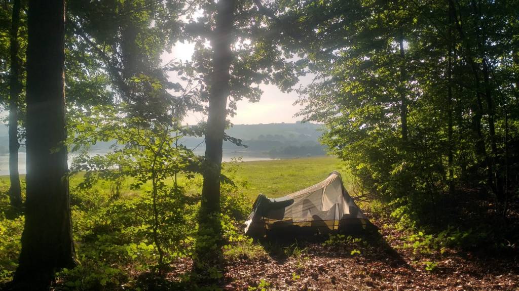 Wir genießen das Abendessen, das uns in Form von gegrilltem Haloumi von der Bush-Box her kommt. Auch die Nacht und der Morgen im Zelt direkt am See nähren uns die Seele. Dennoch bin ich froh, dass wir hier nur eine Nacht „gebucht“ haben (jede weitere hätte weitere 10 EUR gekostet), weil mir plötzlich einfällt, dass ein alter Freund von mir hier in der Nähe den Hof seiner Eltern übernommen hat und zu diesem Hof auch Wald gehören dürfte. Wo wir vielleicht für die zweite Nacht unser Zelt aufschlagen dürfen. Tatsächlich ist dies der Fall und Hans empfängt uns an einer Wegkehre, um uns die Möglichkeiten zu zeigen.