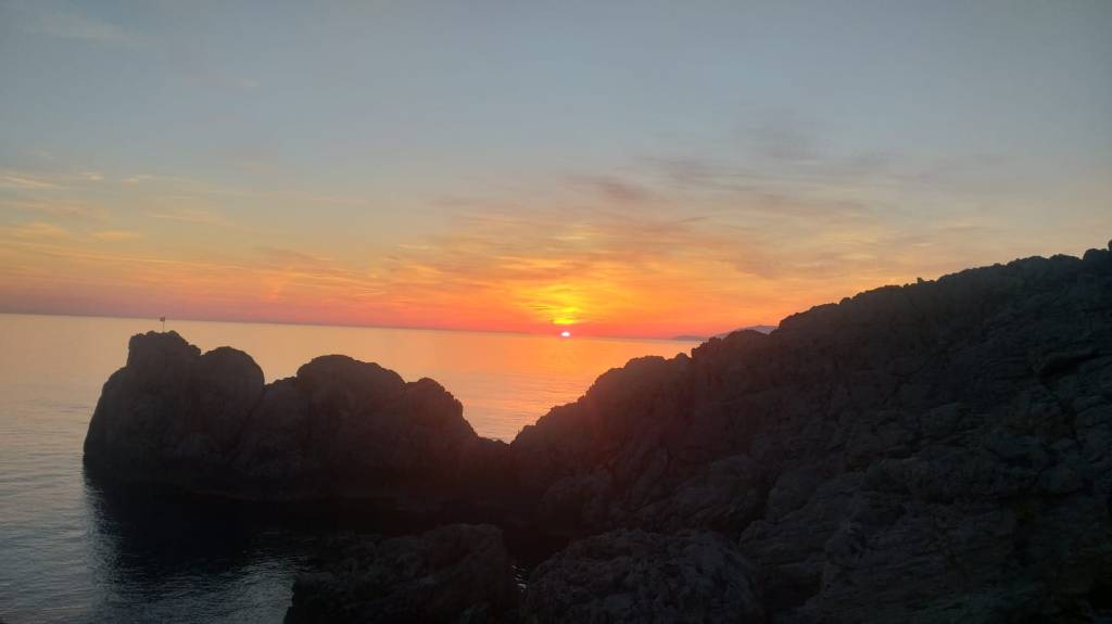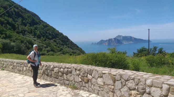 Nach dem Frühstück brechen wir zum Sonnenberg auf, dem Monte Solare, die höchste Erhebung auf Capri. 98% nehmen laut Peter Amann, dem Autor unseres Reiseführers, dort hinauf den Sessellift. Entsprechend einsam sind wir auf den Bergpfaden unterwegs. Oben herrscht dann großer Rummel, weshalb wir zügig weiterziehen. Dem Grad entlang mit wieder spektakulären Ausblicken – die hunderte Meter hohen Klippen hinunter und hinüber nach Ischia. Mehr als diese nächste sicher auch wunderschöne Insel ruft uns allerdings für die Fortsetzung unserer Reise die Costiera Amalfitana. Schließlich wartet dort der sagenumwobene Sentiero degli Dei, der „Pfad der Götter“…
