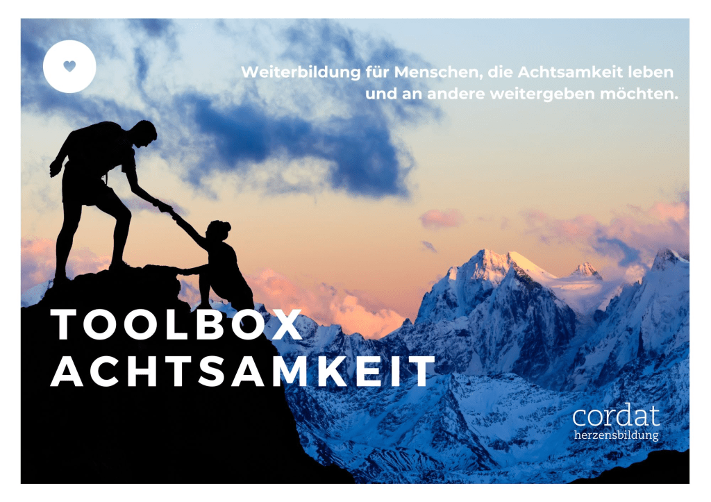 Möchtest auch du in dein Leben oder in dein Unternehmen mehr Bewusstheit, Herzlichkeit und Frieden bringen? Auf www.cordat.org findest du unsere aktuellen Veranstaltungen und Trainingsformate: TOOLBOX ACHTSAMKEIT ist unser Begleitungs- und Weiterbildungsformat für alle, die die Kraft der Achtsamkeit nachhaltig in ihr Leben integrieren – und ggf. auch an andere weitergeben möchten. Der nächste Beginn ist mit dem 1. Modul am 7./8. März! Dieses Format ist übrigens auch als Mutliplikatorenschulung für Einrichtungen und Unternehmen durchführbar. DER SPRINGENDE PUNKT ist unser Trainingsprogramm für Unternehmen. Hier lernen Führungskräfte und Mitarbeitende, nicht nur, wie sie durch Achtsamkeit, Resilienz und Verbundenheit ihre mentale Gesundheit stärken sondern ihren Platz in der Arbeit und im Leben finden.